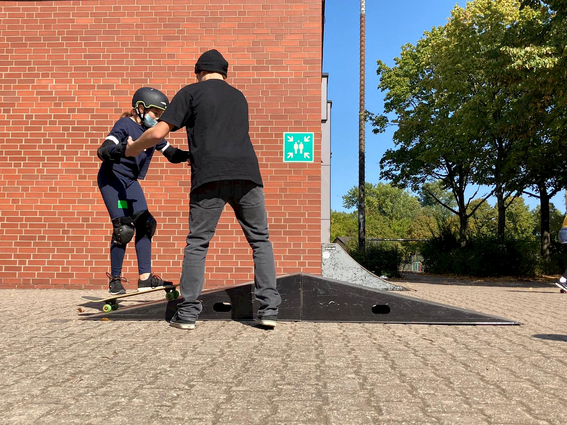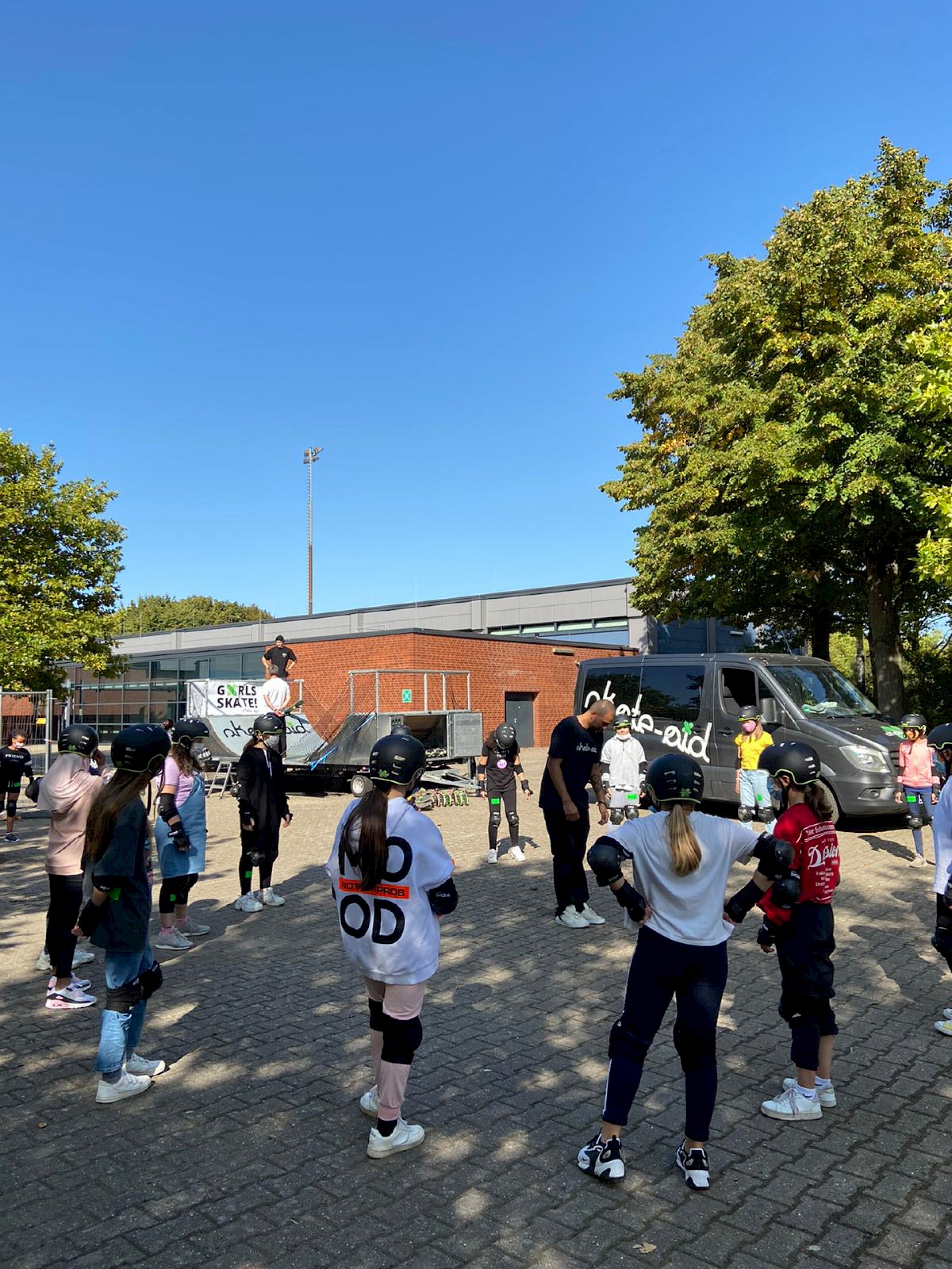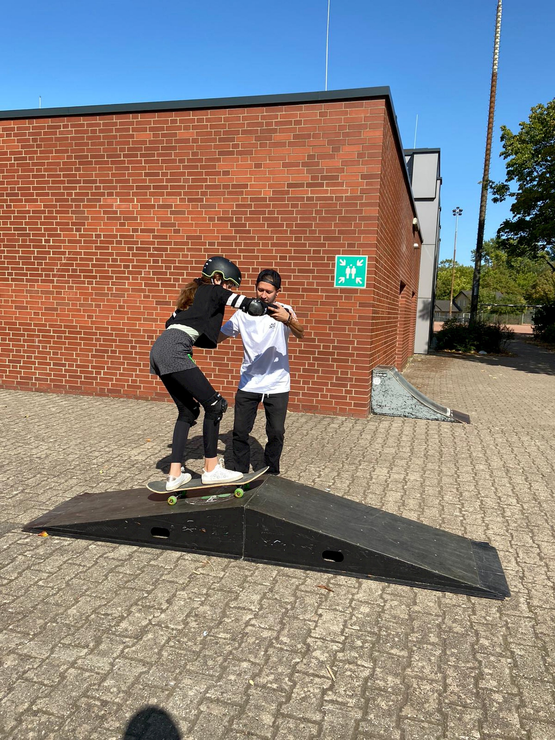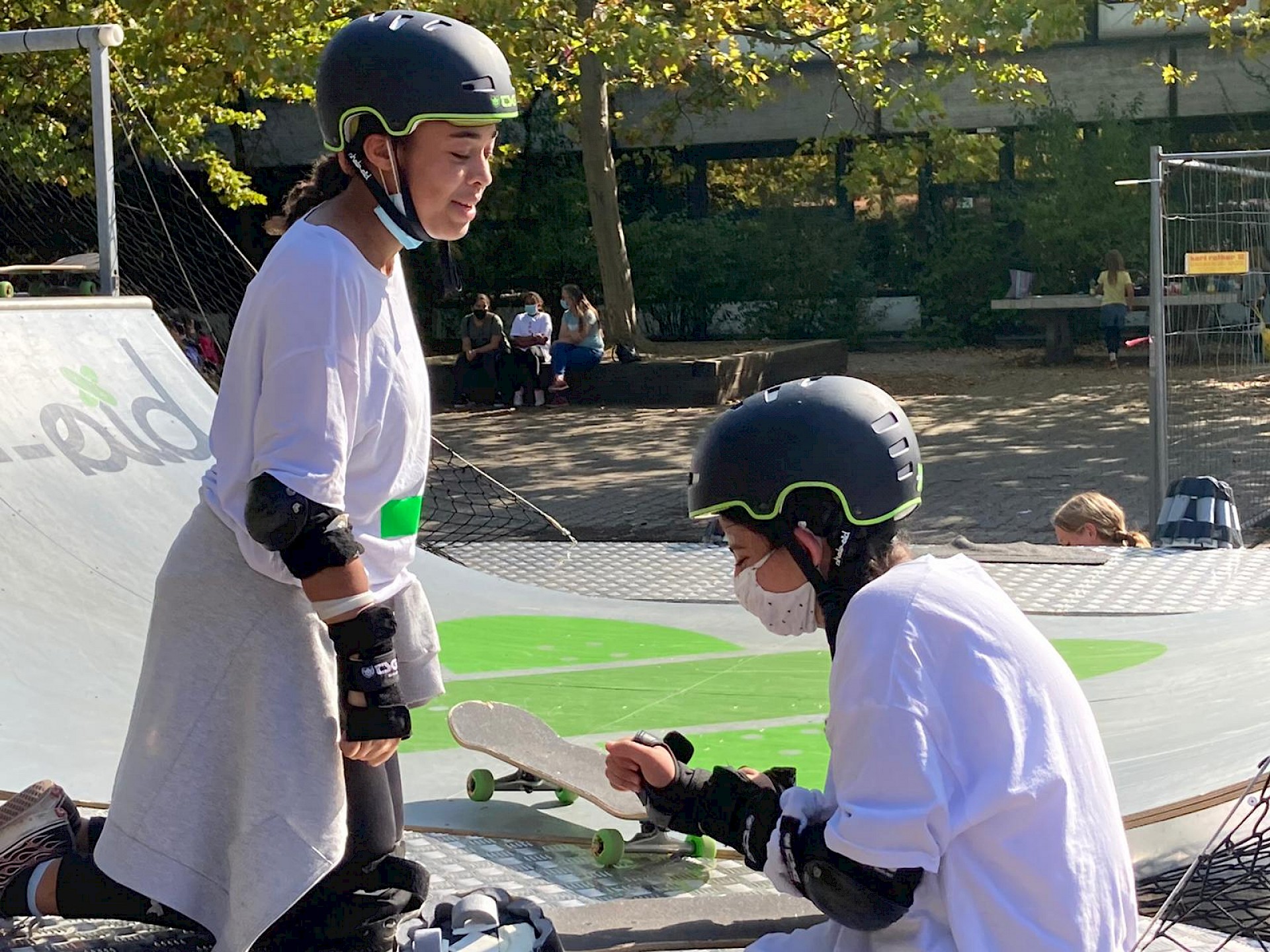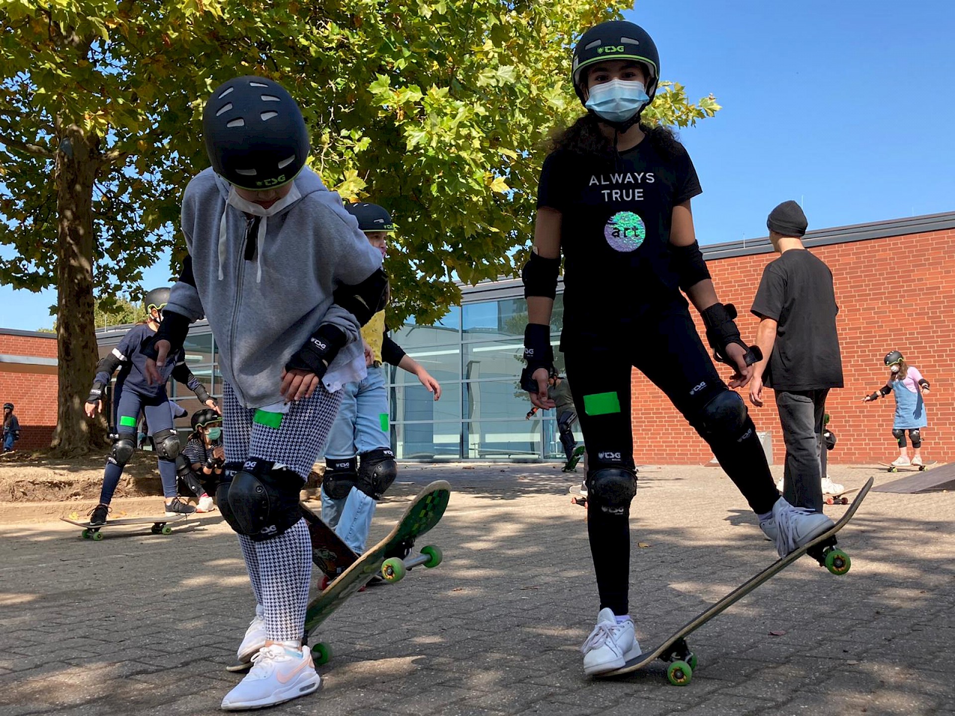 On 19.09.2020 we were in Cologne at the Lise-Meitner-Comprehensive School for one of our free GIRLS SKATE! workshops. Of course our mobile minicamp, obstacles, skateboards, safety gear, helmets and our skate-aid coaches were there too.