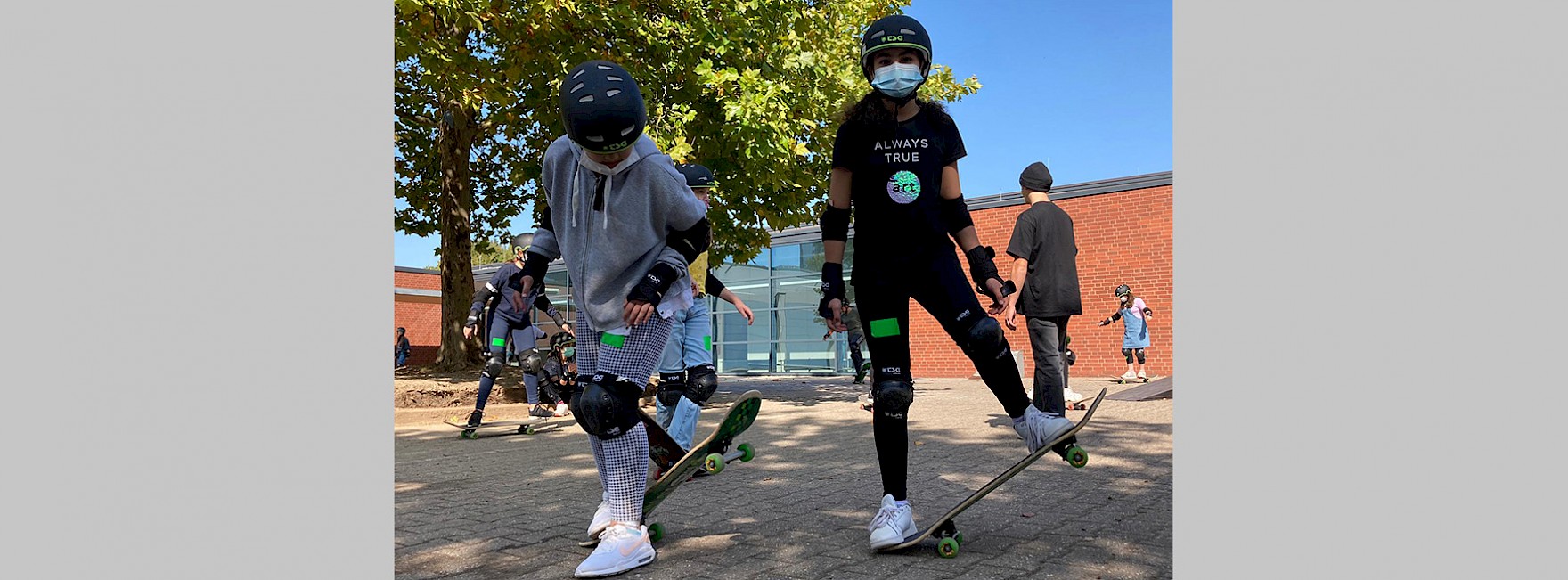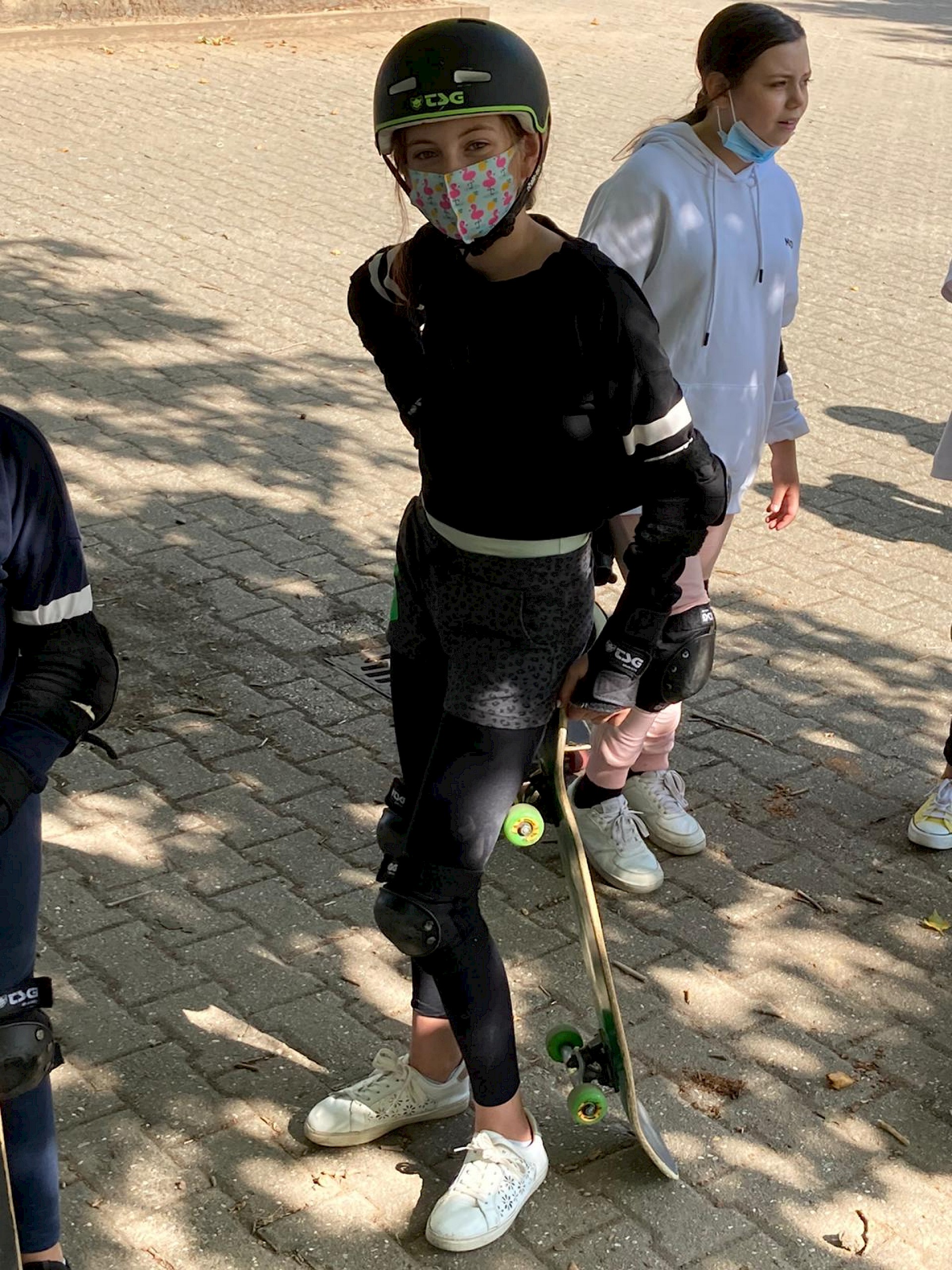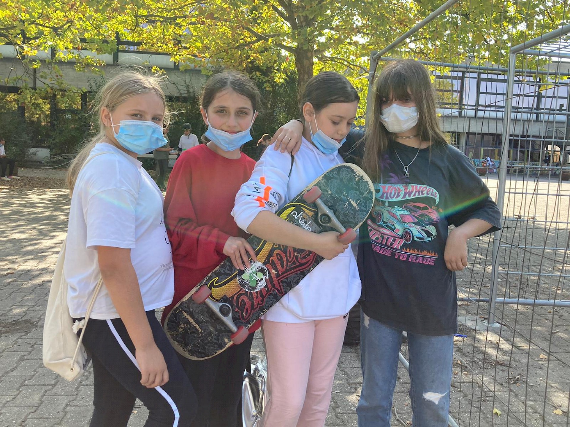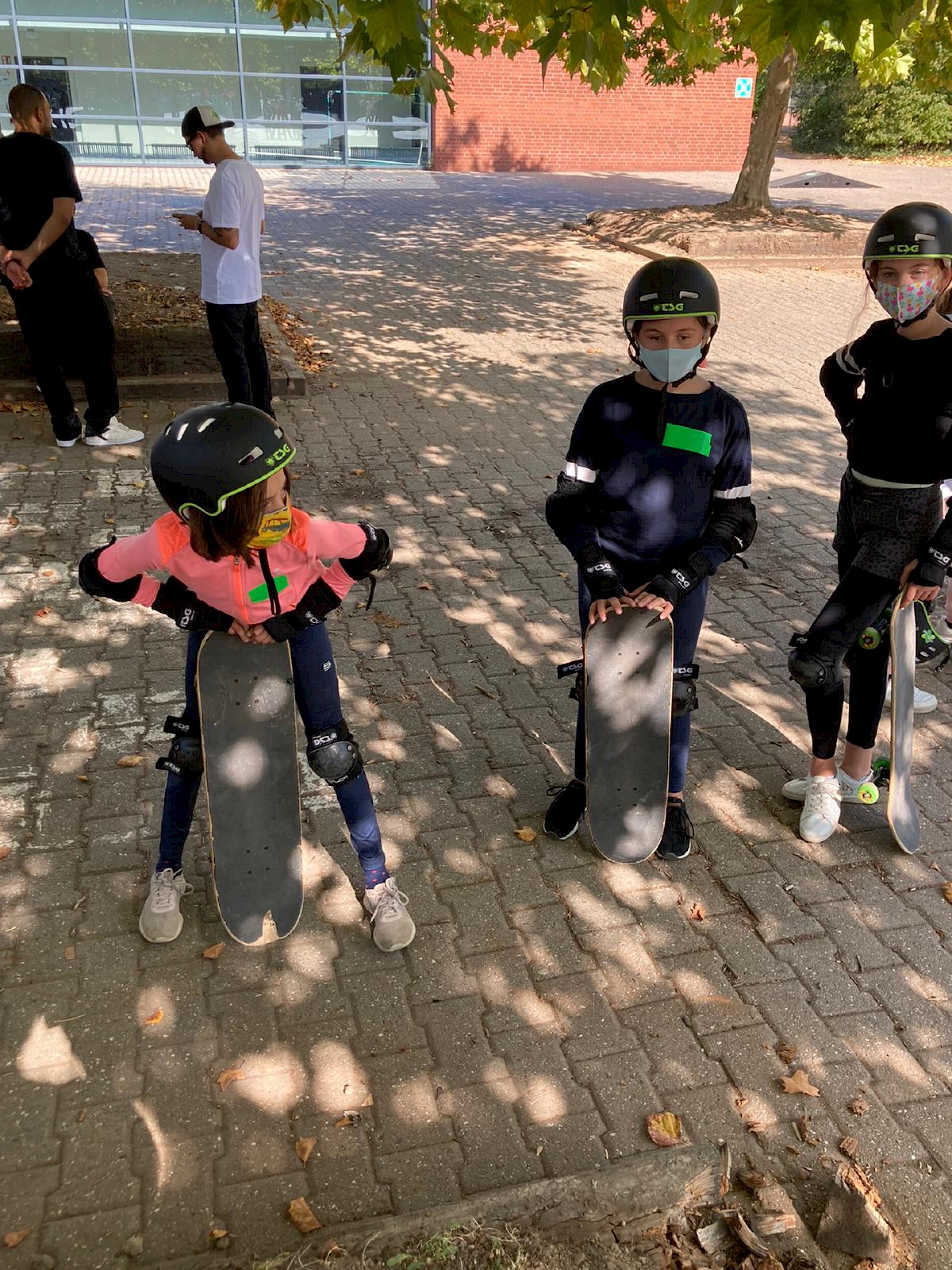 On 19.09.2020 we were in Cologne at the Lise-Meitner-Comprehensive School for one of our free GIRLS SKATE! workshops. Of course our mobile minicamp, obstacles, skateboards, safety gear, helmets and our skate-aid coaches were there too.