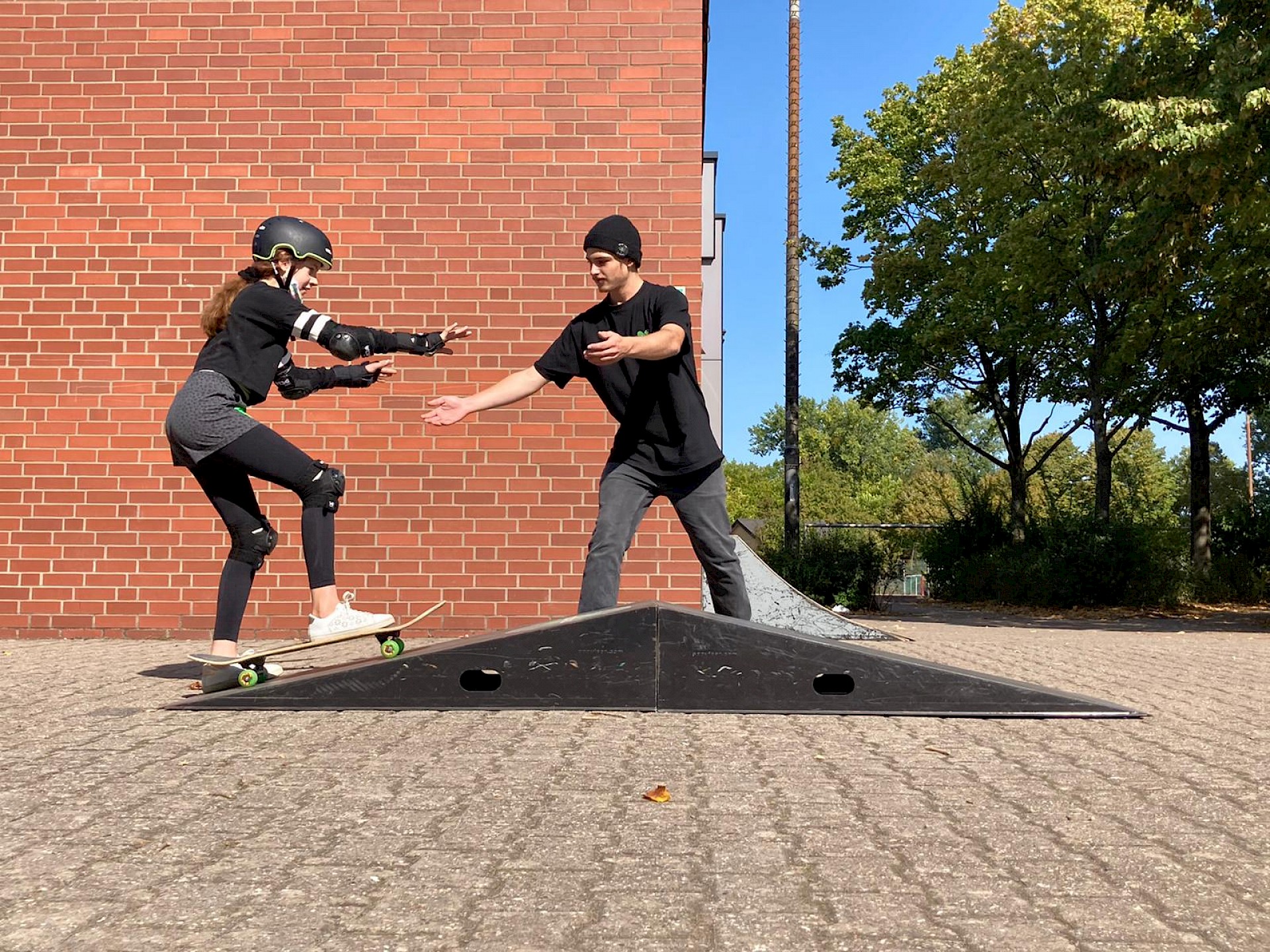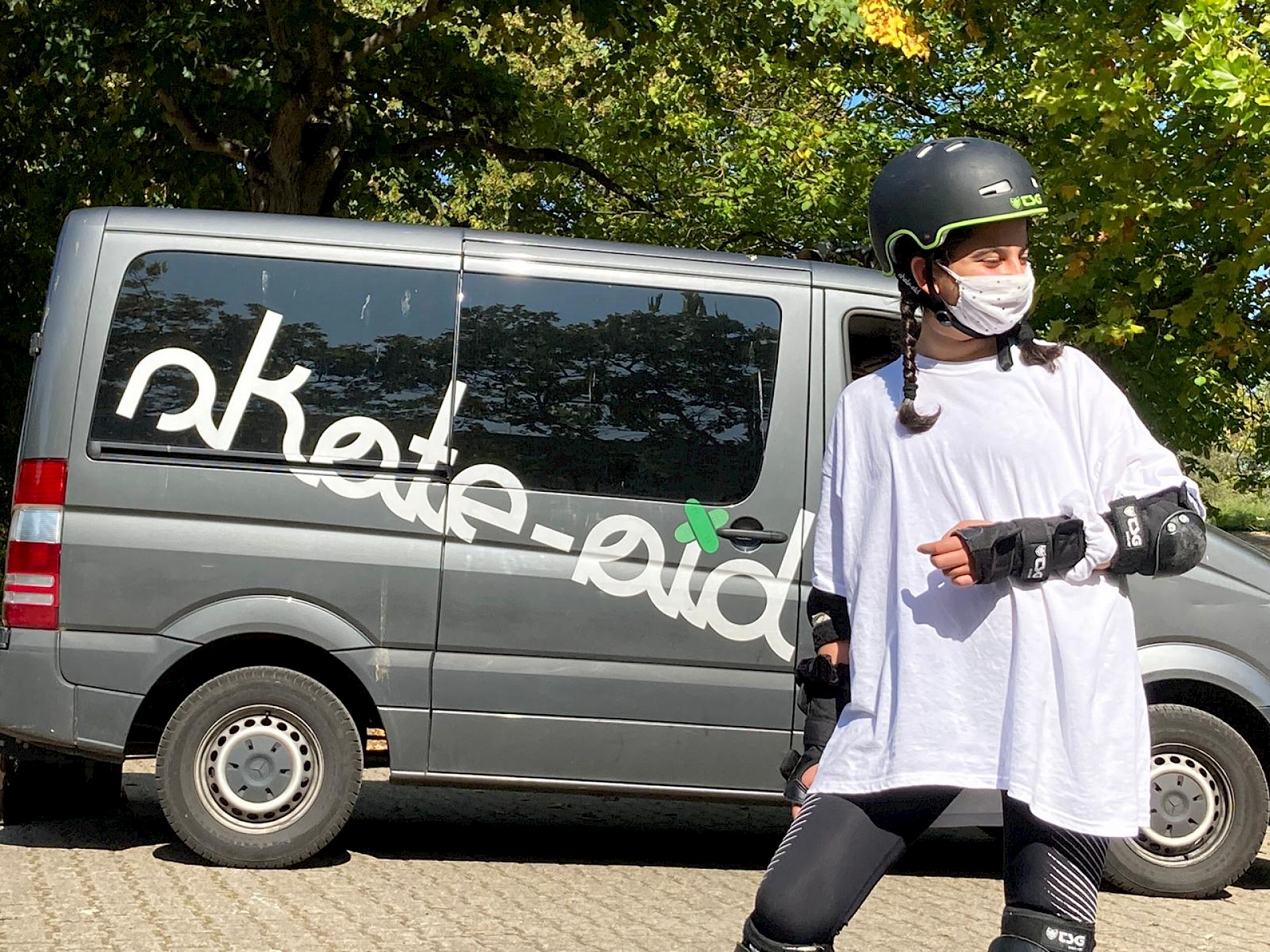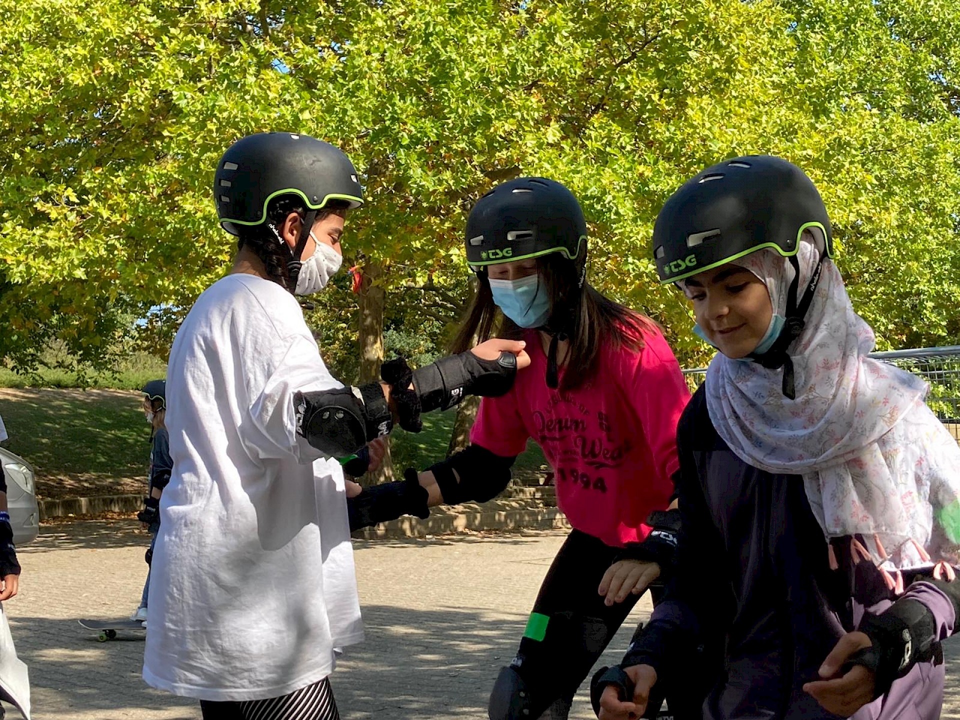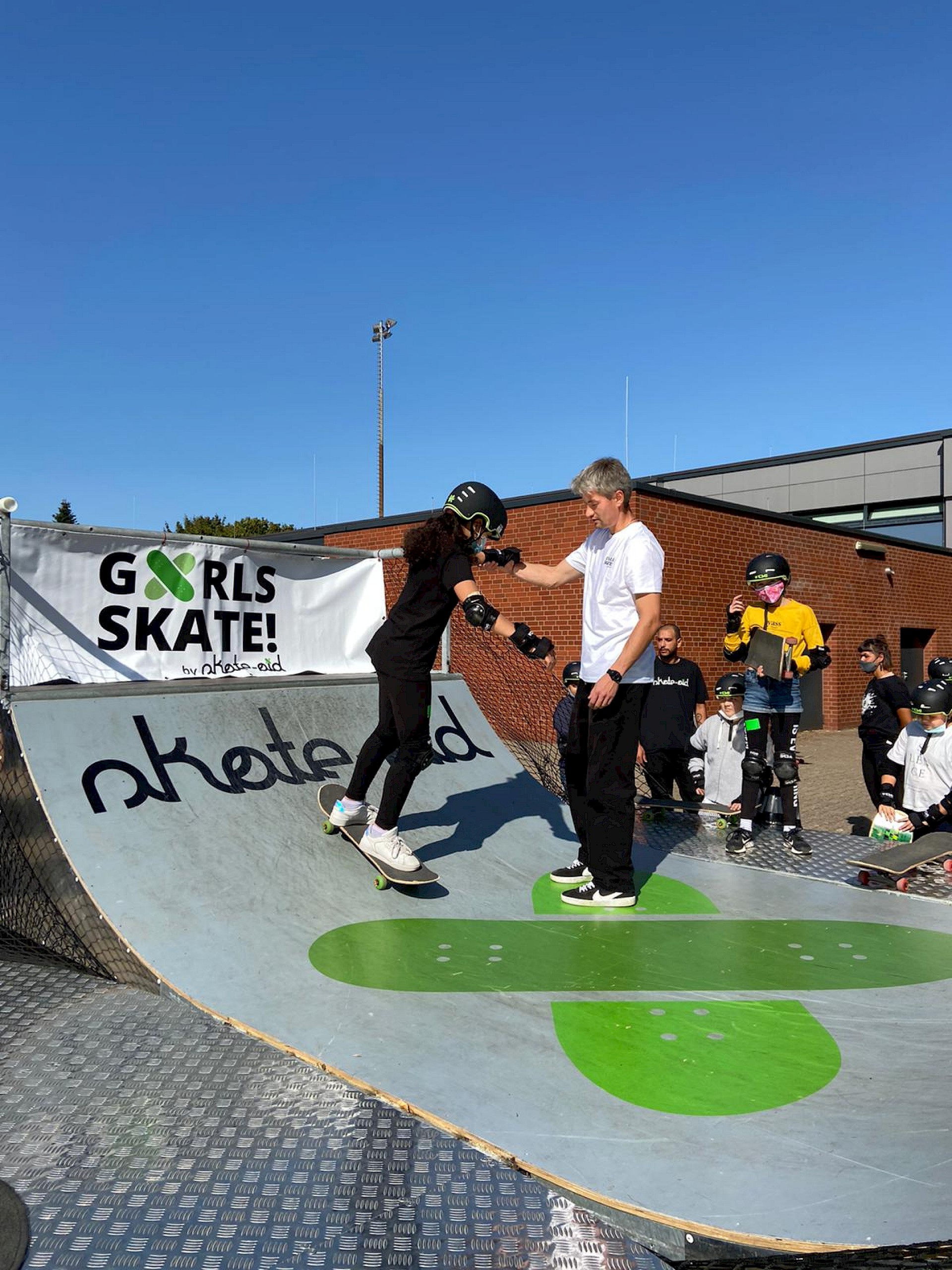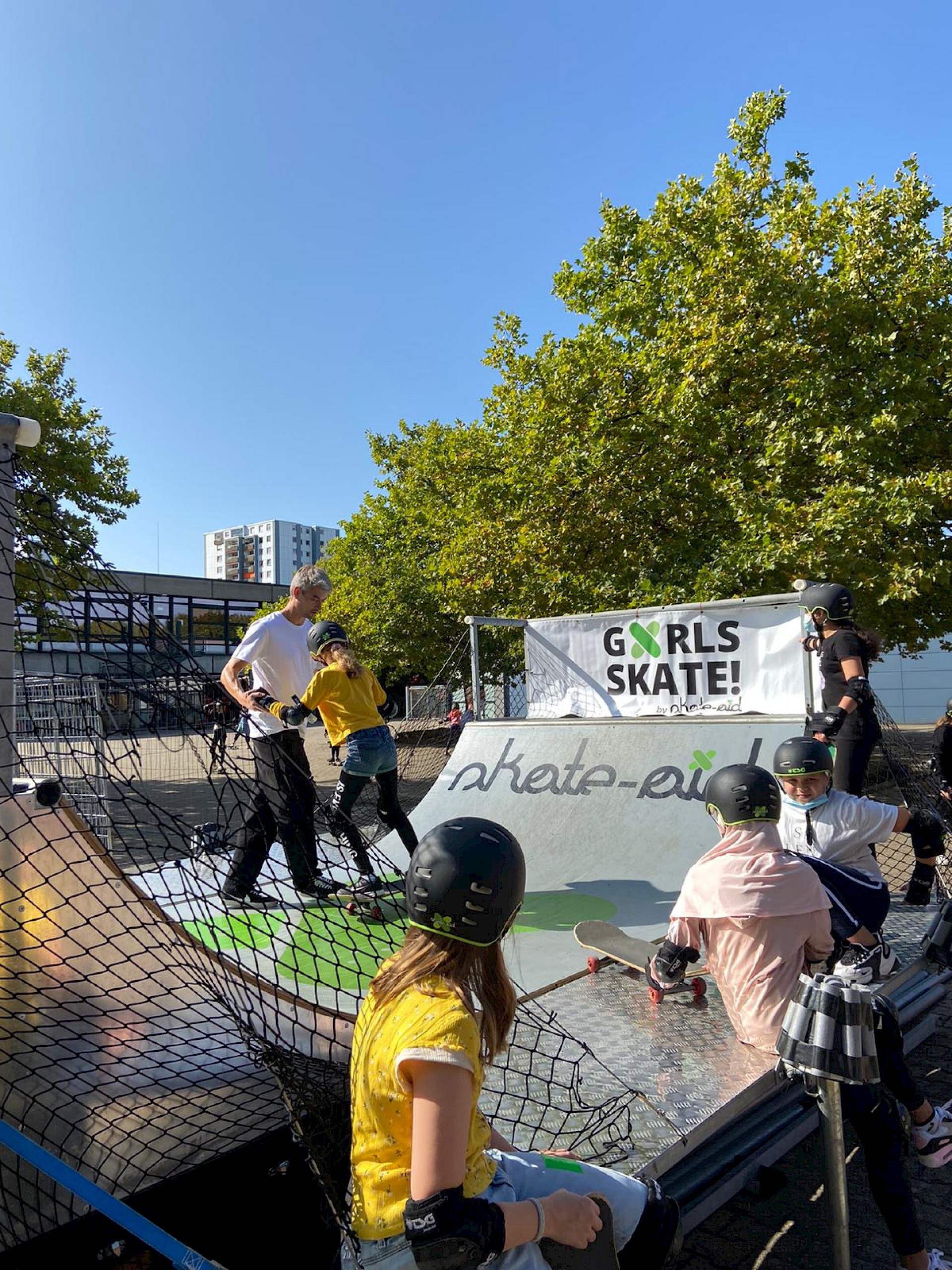 On 19.09.2020 we were in Cologne at the Lise-Meitner-Comprehensive School for one of our free GIRLS SKATE! workshops. Of course our mobile minicamp, obstacles, skateboards, safety gear, helmets and our skate-aid coaches were there too.