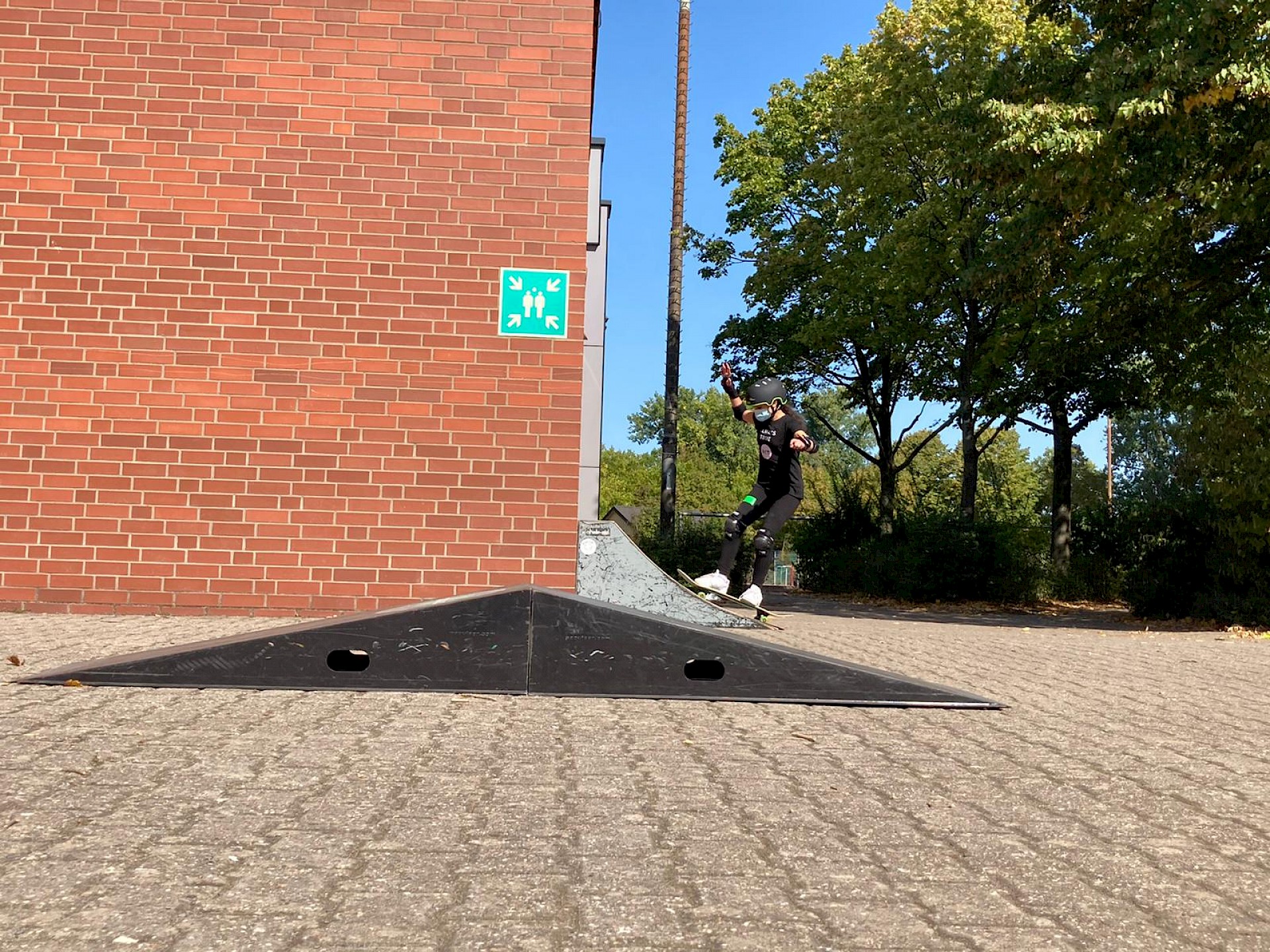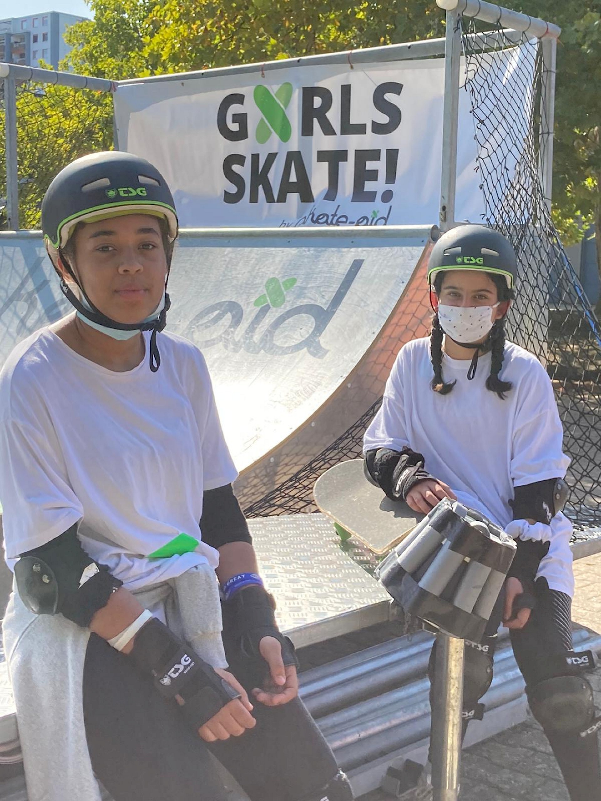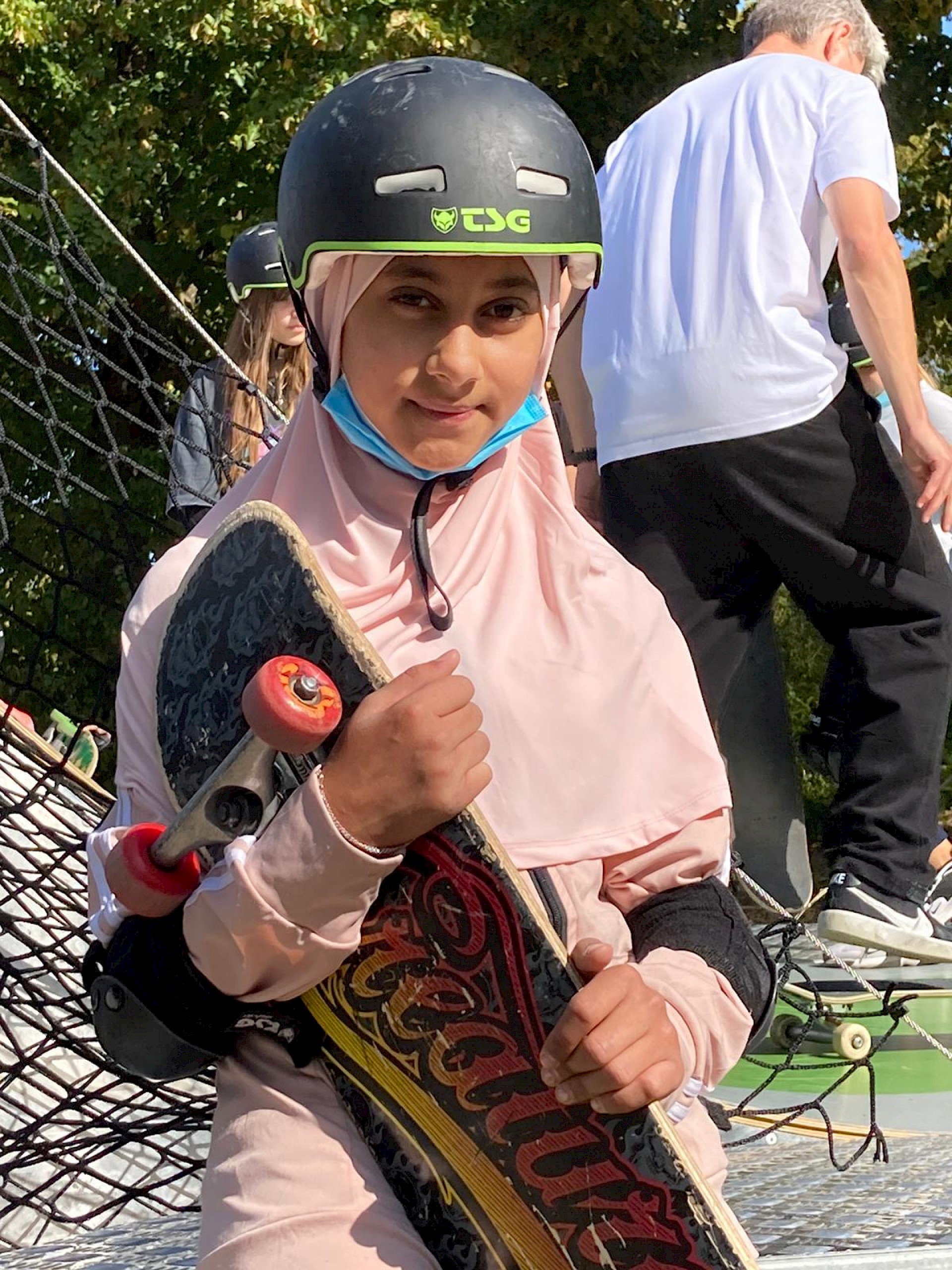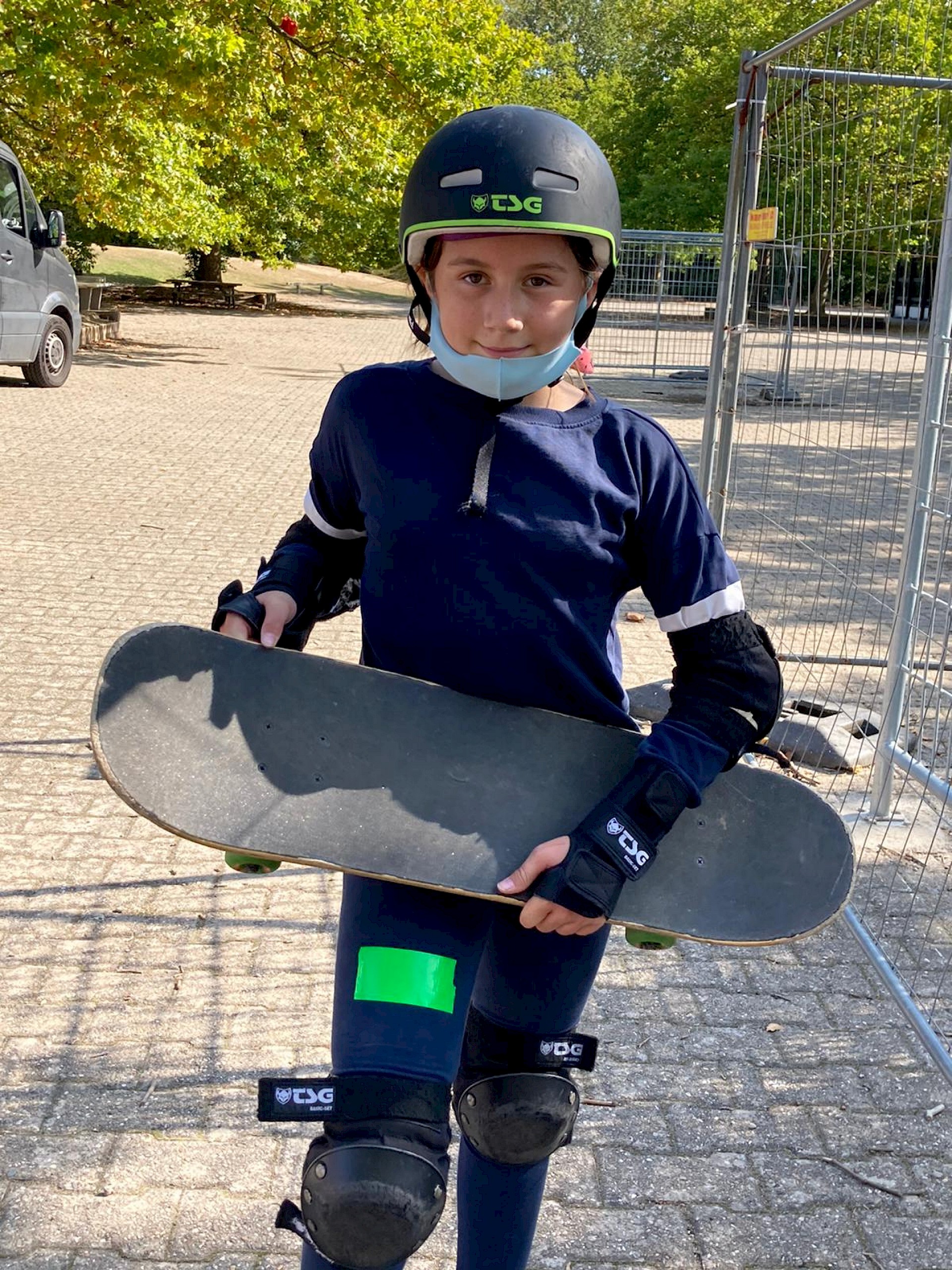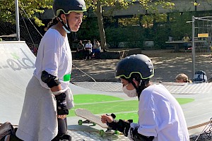 On 19.09.2020 we were in Cologne at the Lise-Meitner-Comprehensive School for one of our free GIRLS SKATE! workshops. Of course our mobile minicamp, obstacles, skateboards, safety gear, helmets and our skate-aid coaches were there too.
