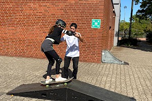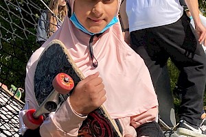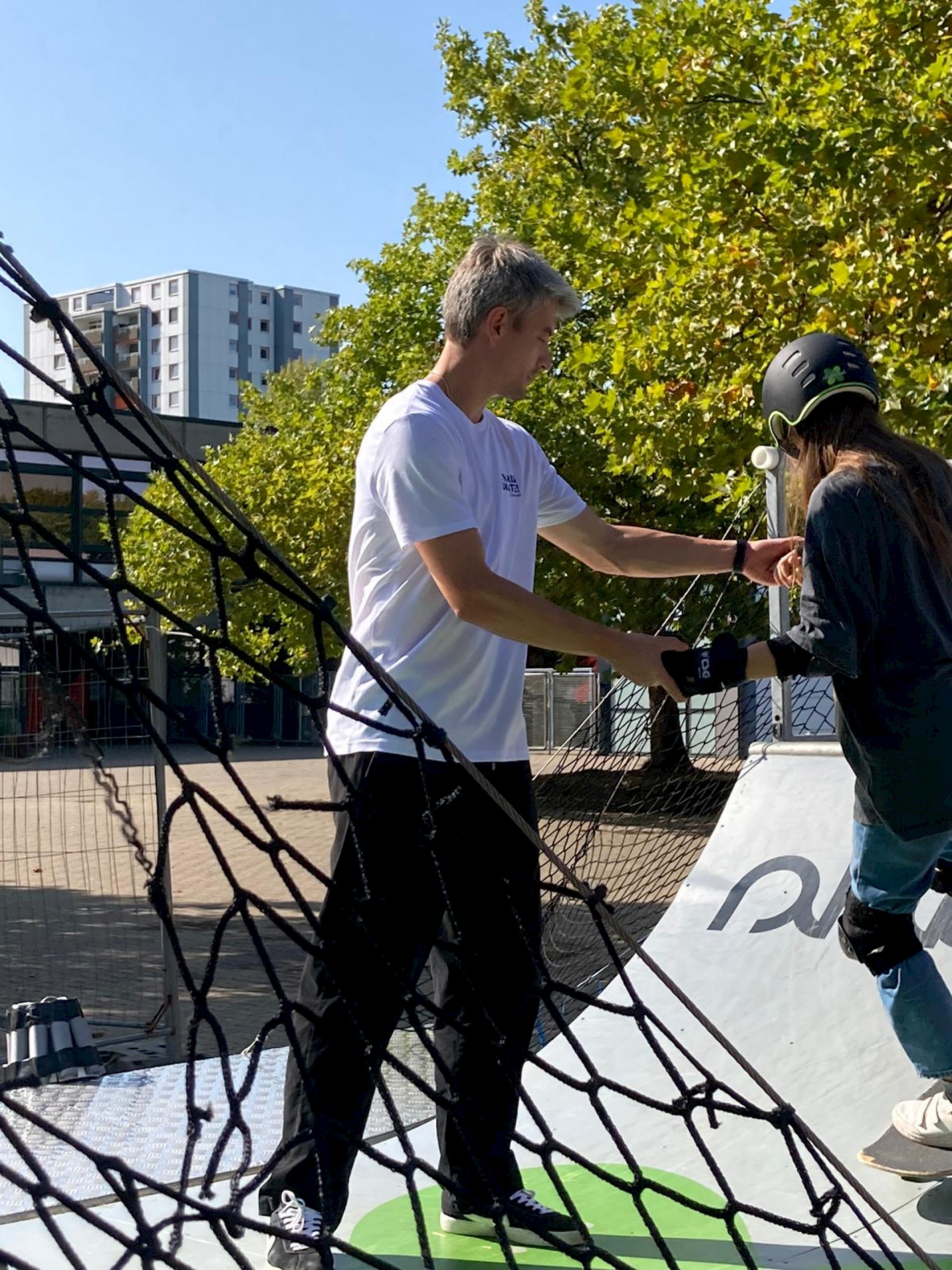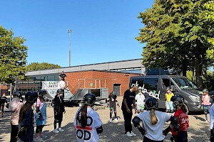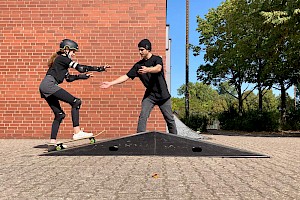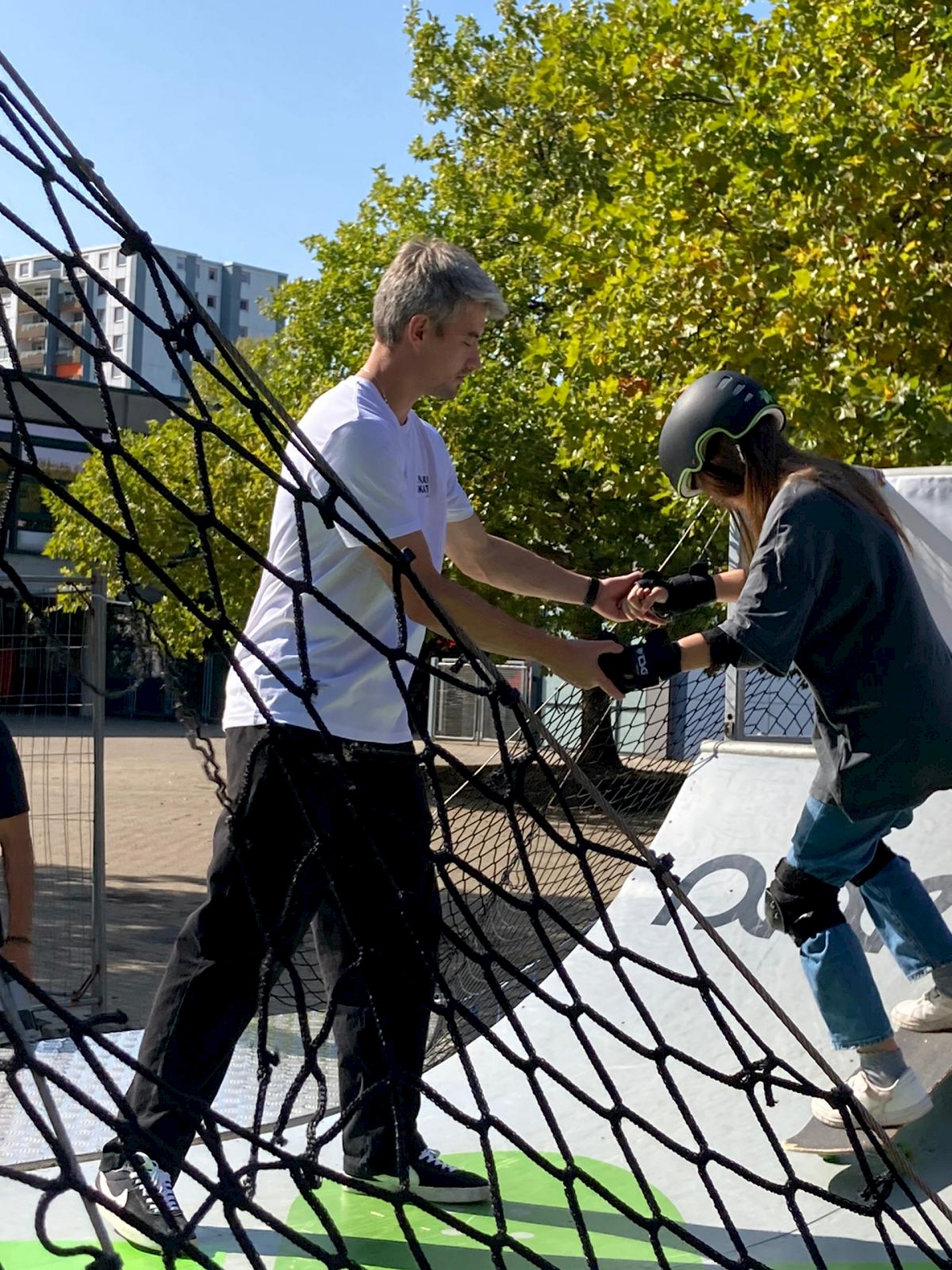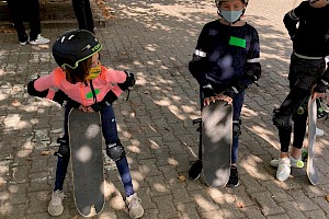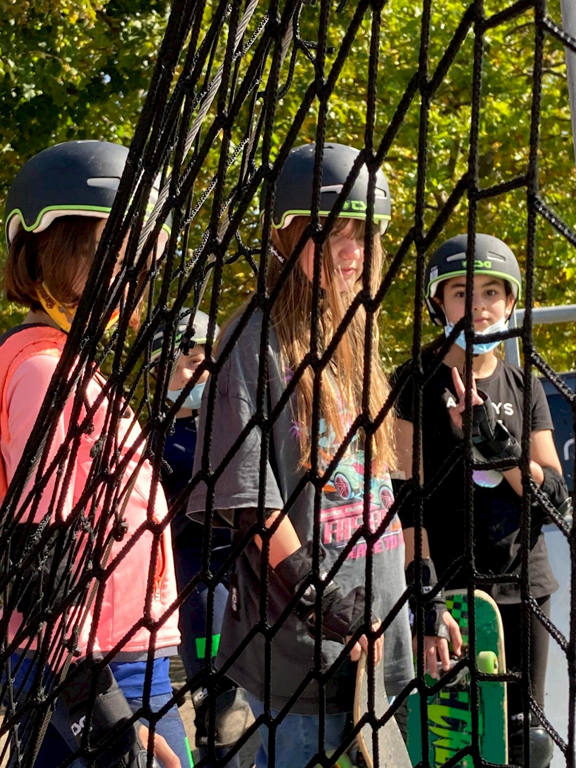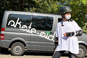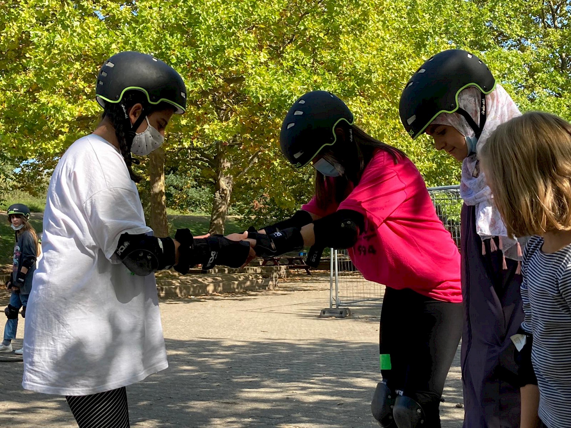 On 19.09.2020 we were in Cologne at the Lise-Meitner-Comprehensive School for one of our free GIRLS SKATE! workshops. Of course our mobile minicamp, obstacles, skateboards, safety gear, helmets and our skate-aid coaches were there too.